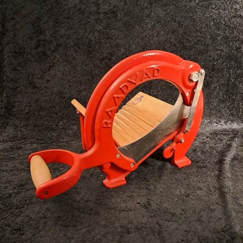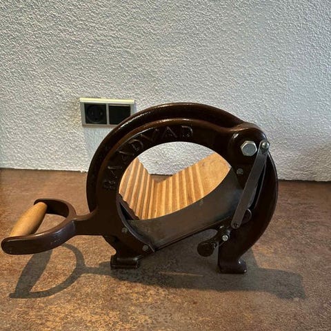 Den fungerer perfekt til at skære rugbrød – og den er også en samtalestarter som en rustik reol eller pynteting i et køkken, studie eller man cave.