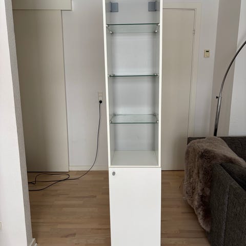 Badeværelses højskab NYSJÖN i hvid med justerbar ben. Den har to ben og er beregnet til at stå op ad en væg. Den er 3,5 gammel, og står stadig meget pæn.
