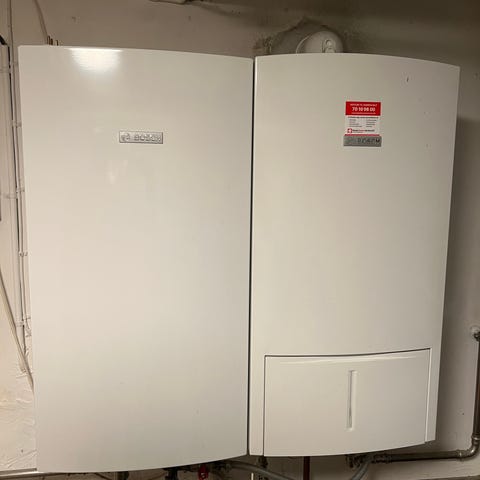 Bosch gasfyr med indbygget styring og display på fronten. Enheden har reguleringsknapper til temperatur og driftstilstand samt trykmåler. På indersiden af frontklappen findes indstillingsskema med tekniske data og anbefalede værdier. Velegnet til opvarmning af bolig via centralvarmesystem. Monteres stående på væg med tilslutning til eksisterende rør- og elinstallationer.