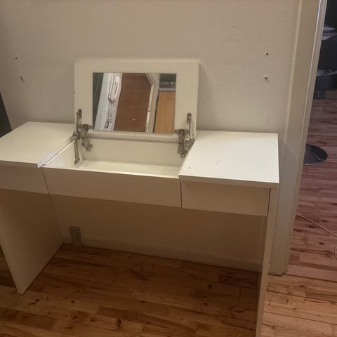 Flot makeupbord sælges samlet med spejl, spejllys og gratis stol. Perfekt til makeup og styling. Det hele er i fin stand og klar til brug.