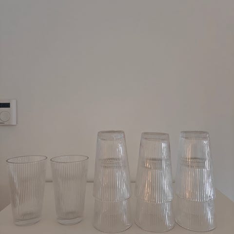 Stelton Pilastro drikkeglas i klart glas med rillet struktur på ydersiden. Glassene er velegnede til vand, juice og andre kolde drikke. Designet gør dem stabile og nemme at stable. Passer til daglig brug i køkken og spisestue.