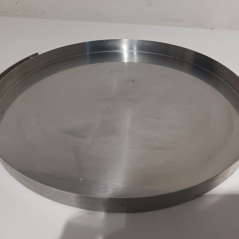 Arne Jacobsens serveringsbakke i rustfri stål. Bakken har diskrete greb, der følger den cylindriske form og gør det nemt at flytte bakken.