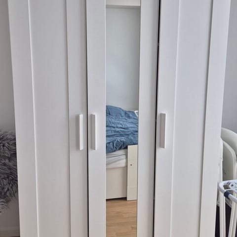 Stilrent og velholdt klædeskab i hvid med klassiske fyldningslåger. Skabet fremstår pænt og solidt og passer perfekt ind i både soveværelse, entré eller gæsteværelse.