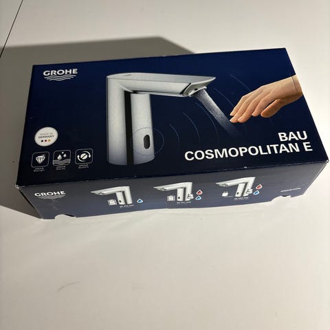 Grohe berøringsfri håndvaskarmatur i krom. Armaturet er sensorstyret og egnet til montering på håndvask. Leveres med tilslutningsslanger, monteringsdele og installationsvejledning som vist på billederne. Overfladen er i blank krom, og tudens udløb er integreret i fronten af armaturet. Velegnet til brug på badeværelser eller gæstetoiletter, hvor der ønskes berøringsfri betjening.
