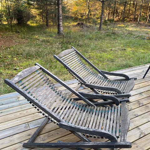 2 dækstole i teak med fodskammel og tilhørende grå hynder