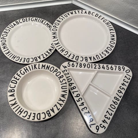 Design Letters skålesæt bestående af tre hvide skåle med sorte bogstaver samt tilhørende træbakke med udfræsede cirkler til skålene. Skålene er velegnede til fx snacks, tilbehør eller små serveringer og kan bruges i køkkenet eller på bordet som en del af borddækningen.