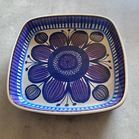 Royal Copenhagen Aluminia askebæger/fad, designet af Kari Christensen. Blå og brune nuancer. Fajance. 17 x 17 cm. Et flot lille slikfad.