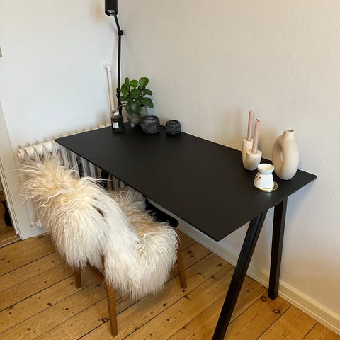 Smukt skrivebord i egetræ og sort linolium. Har enkelte brugsspor (skruehuller efter kabelholder og mærke efter arkitektlampeholder). Bordet kan skilles ad for nem transport. Sendes ikke.