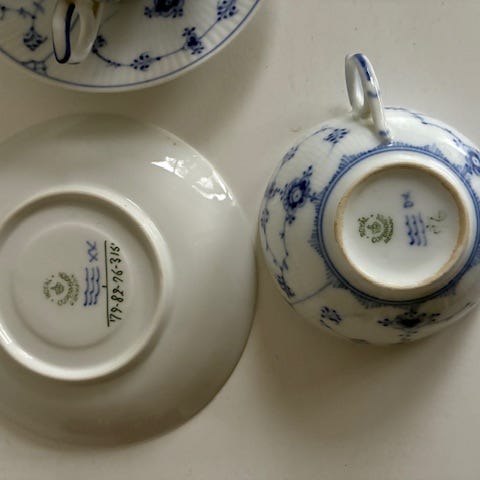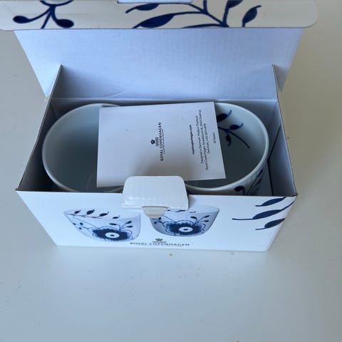 Royal Copenhagen musselmalet tekop med underkop porcelæn hvid/blå