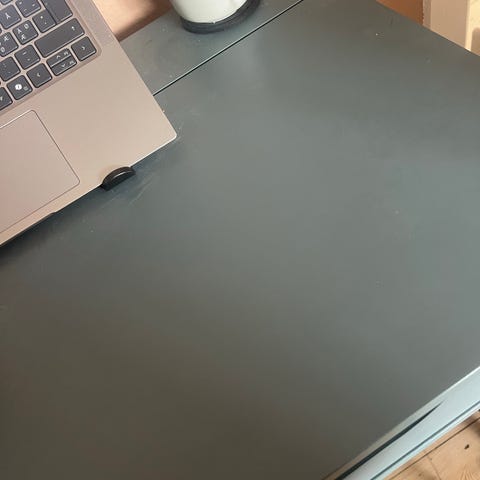2m lang bordplade, skabsmodul i den ene side, skuffemodul i den anden.