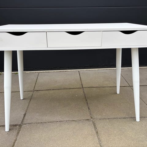 Sælger børne skrivebord inkl stol billigt. Den er godt brugt, i mange år men udover tegn på lidt slid fejler den ikke noget. Der er sat lidt klistermærker på som stadig sidder på og stolen har lidt ridser og er blevet tegnet på. Nærbilleder af det hele.