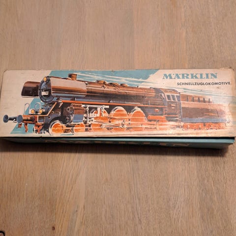 Märklin tenderlokomotiv modeltog. Lokomotivet leveres i original æske med indlæg. Klassisk damplokomotiv med røde hjul og sorte overflader, egnet til modeltogsanlæg og samling. Yderligere tekniske specifikationer som skala og modelnummer fremgår ikke af billederne.