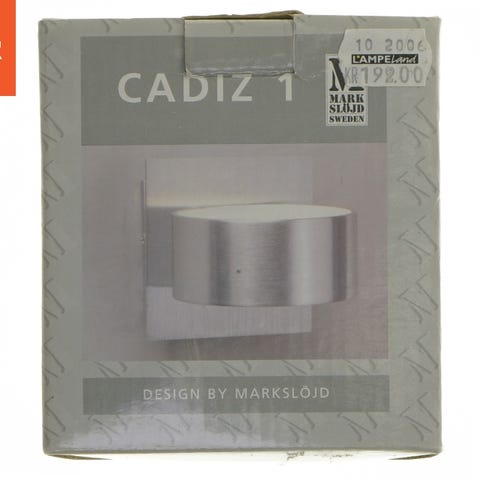 Cadiz 1 er en væglampe designet af Markslöjd. Denne lampe kommer i sin originale emballage, og består af en cylinderformet lampe med beslag, komponenter og tilbehør. Lampen har en diameter på 8 cm og inkluderer installationsvejledning og skruer til montering. Farven er primært sølv, og den har en moderne og enkelt design.