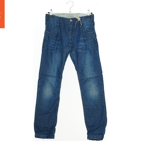 Denimbukser med fem lommer og bæltestropper. De har en almindelig pasform og er lavet af blå denimstof. Der er synlige sømme og typisk jeans-lynlås og knaplukning.
