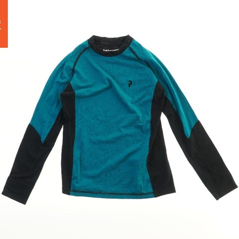 Langærmet trøje i blå og sort med rund hals. Trøjen har kontrastfarver på ærmerne og langs siden.