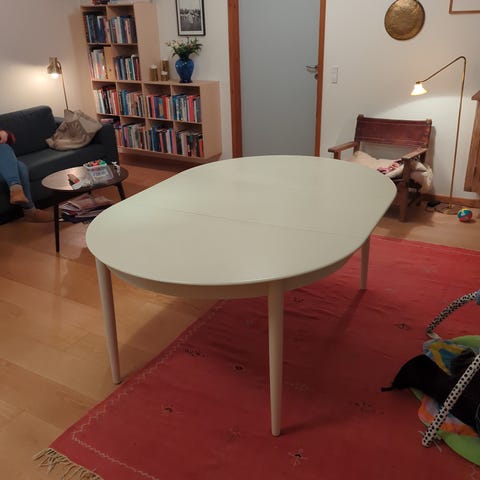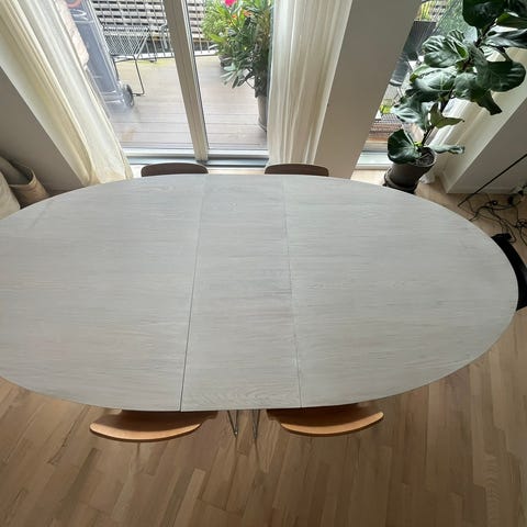 Ovalt spisebord i massivt træ i sort med centralt søjleben og fire buede fødder. Bordpladen består af tre sektioner, hvor de to sider kan foldes ned. Velegnet som spisebord i køkkenet eller spisestuen. Bordpladen har synlige tegn på slid, kan nemt restaureres.