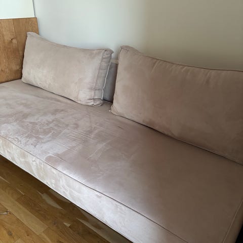 Sovesofa i pæn stand på nær der er et hul i det hvide betræk der over selve skummadrassen men har ingen betydning det under bunden medfølger også gråt aftageligt betræk til udover kan vaskes