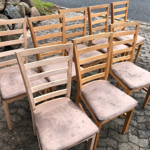 8 spisebordsstole i eg . Stolen har lodrette tremmer i ryggen. Behagelige at sidde på.