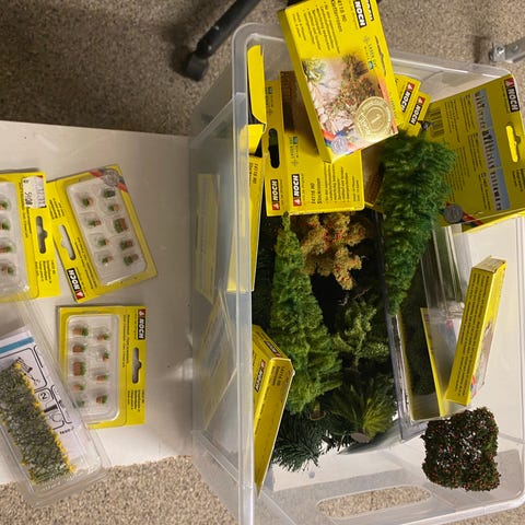 Stellpult kontrolpanel til modeltog med flere farvede trykknapper til styring af spor eller tilbehør. Enheden har blå kabinet og knapper i grøn og rød samt lyse betjeningsfelter. Velegnet som styringsenhed i modeljernbaneopstillinger eller lignende elektriske anlæg, hvor der er behov for manuel kontrol af flere funktioner fra ét samlet panel.