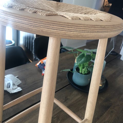Jørgen Bækmark J83 skammel med stel af lakeret bøg, og med sæde af naturflet. Skamlen er fra 1980'erne og fremstår i god stand, med let slid på flet og stel. Skamlen fremstår med let revne i stellet. •Designer: Jørgen Bækmark •Producent: FDB Møbler •Produktions år: 1980'erne •Model: J83 •Mål: Højde 41 / Bredde 52 / Dybde 38 Cm •Materialer: Bøg og papirsnor •Stand: Brugt Jørgen Bækmark J83 skammel i bøg 1980'erne