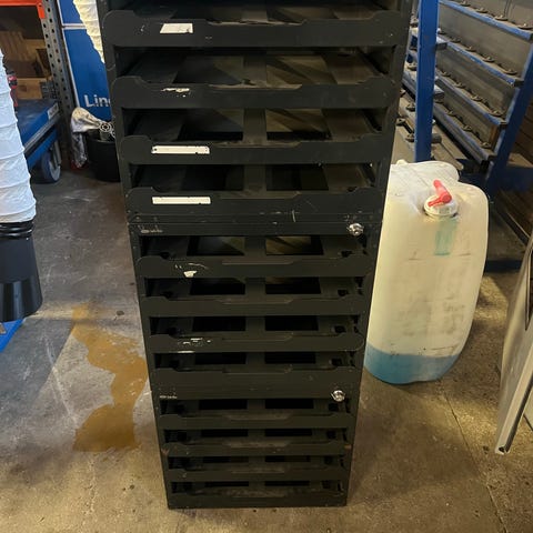 Reol eller skab leveres i flade pakker, klar til montering. Delene fremstår i træfarvet spånplade eller lignende plademateriale med forborede huller til samling. Der medfølger flere plader samt lange skinner eller lister, som sandsynligvis bruges til konstruktionen. Produktet egner sig som opbevaringsmøbel i f.eks. stue, værelse eller depotrum, afhængigt af endelig samling og anvendelse.