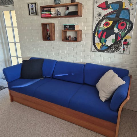 Sovesofa i lyst træ med rødt uldpolstring. Sofaen har ryglæn og armlæn i samme røde stof samt fletgavle. Den kan trækkes ud til dobbeltseng, hvor der medfølger madras med orginal Hestbækbetræk. Velegnet som kombineret sofa og gæsteseng i stue, gæsteværelse eller sommerhus.