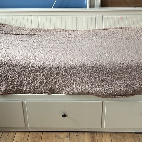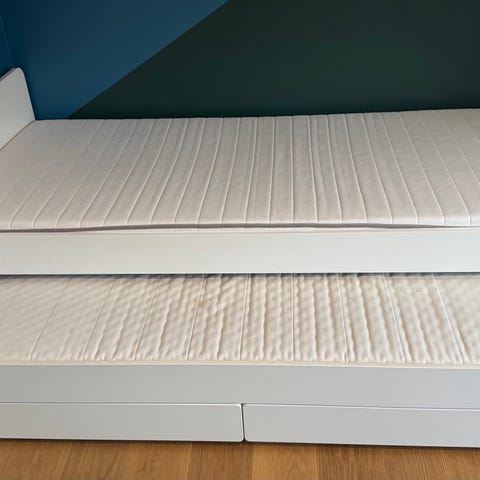 IKEA dagligdags seng med udtræksseng og skuffer i hvid. Sengen består af en hovedseng og en ekstra udtræksseng under, som kan trækkes ud ved behov. Under sengen er der integrerede skuffer til opbevaring af fx sengetøj eller tøj. Velegnet som gæsteseng eller til værelser, hvor der er behov for ekstra soveplads og opbevaring i ét møbel.