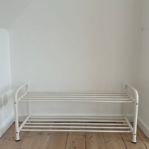 Væghængt sko-reol i hvid metal sælges.