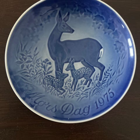 Mors dags platte fra 1986. Denne tallerken er en Bing & Grøndahl 'Mors Dag' tallerken fra 1986 med en blå og hvid farve. Den har en diameter på Ø 15 cm og viser et design med elefanter i det indre. Bunden af tallerkenen har Bing & Grøndahl mærke samt Dekor nummer 9386.