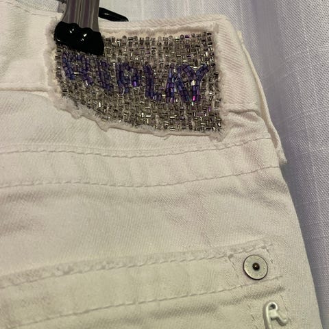 Smarte bukser fra Replay i bomuld og elastan. Modellen er lavtaljet, benene straight med ekstra vidde forneden. Fine detaljer med lædersnor og pynt på baglommer, der har lynlås. Livvidde 32, benlængde 34. De måler 105 cm fra linning til fod. De måler 45 (x2) cm i livet.