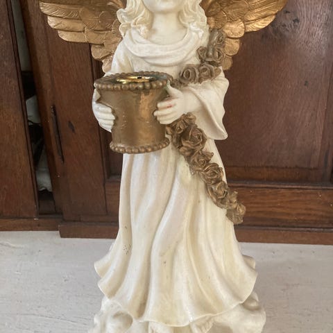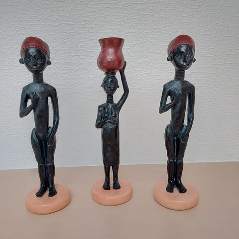 Dekorativ egyptisk figur udformet som en knælende person, der holder en skål til fyrfadslys eller lille bloklys. Figuren er udført i guld- og sølvfarver med detaljer i mønstret hovedbeklædning og dragt. Den står på en rektangulær fod med dekoration langs kanten. Velegnet som lysestage eller pynt i stue, entré eller andre indendørs rum. Materialet fremstår som malet komposit/resin eller lignende hårdt materiale.