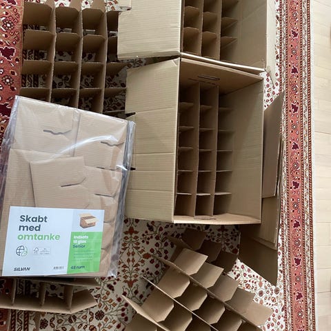 5 Kasser med nye blandet boligtilbehør plus praktiske ting, asserios Blandt indholdet ses en Colors loftlampe i orange,taske fra amust iPad holder til bil osv.