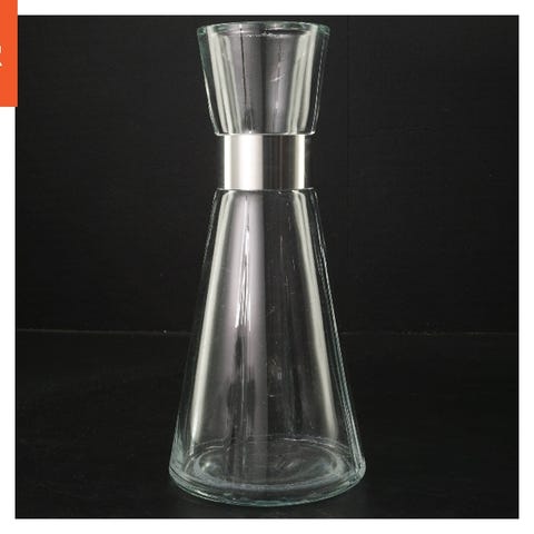 Denne genstand er en rund glas karaffel, der måler 22 cm i højden. Den har et klart glasdesign med et håndtag og et forseglet låg. Karaffelen har en rund bund og et bredt krop, der snævrer ind mod det øverste hvor låget sidder fast.