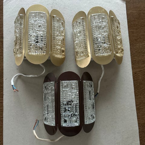 Et par vintage væglamper med glasafskærmning og guldfarvet metalbeslag. Kan både bruges som væglamper i gangen, som sengelamper eller som læselamper. De har en rillede glasstruktur, der skaber et dekorativt lysspil. Størrelsen på hver lampe er 27x12 cm. Sælges samlet og prisen er for begge to.
