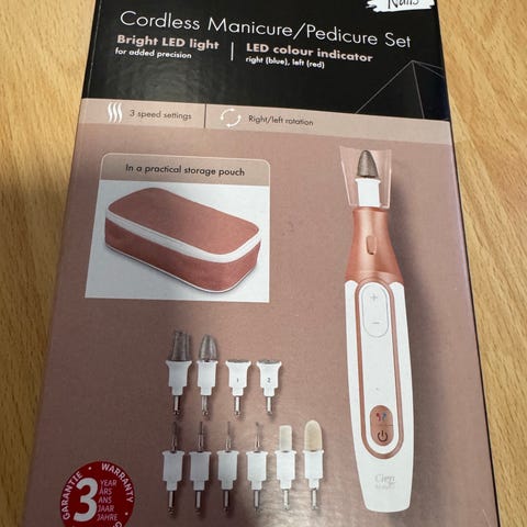 Dette er et professionelt manicure og pedicure sæt fra Quigg. Sættet indeholder flere værktøjer til Manuel pleje af negle, herunder en elektrisk fil, diverse bor og tilbehør. Sættet kommer med en strømforsyning til opladning og er designet til hjemmebrug. Produktet har dimensioner på ca. 25 cm i længden.