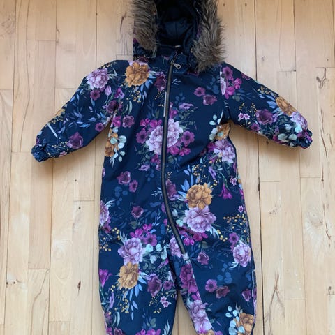 Flyverdragt i pink farve med en hætte og lynlåslukning foran. Dragten har elastik i taljen og manchetter ved hænder og fødder for at holde varmen inde. Der er refleksbånd ved benene for ekstra synlighed.