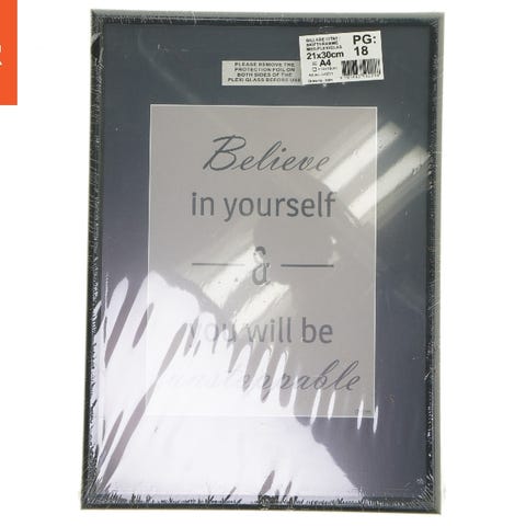 Billedramme med illustration af en kat i form af en enhjørning, der sidder på en regnbue. Rammen er sort og måler 43x33 cm. Den har monteringsbeslag på bagsiden til ophængning.