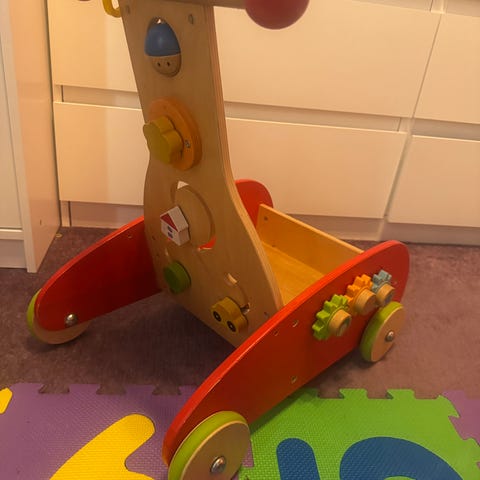 En gåvogn designet som en bil med fire hjul. Vognen er hovedsageligt blå med sorte detaljer, og den har hvide dæk med gule fælge. Den har et håndtag, som børn kan holde fast i, når de bruger vognen til at støtte sig eller gå med. Vognen har et rum til opbevaring af legetøj eller andre småting. Den passer til børn, der er i gang med at lære at gå og giver dem en sjov måde at bevæge sig på.