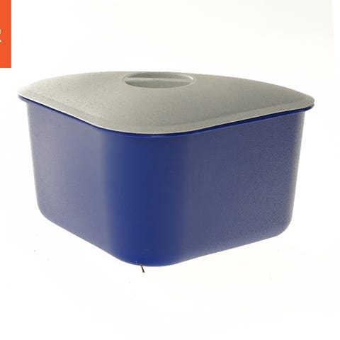 Denne plastkontainer er oval og har en rød krop med et beige låg. Den er designet til opbevaring og indeholder også en aftagelig indvendig bakke med håndtag, som muligvis er beregnet til dræning eller sortering af indholdet. Kontaineren er ideel til køkkenbrug, f.eks. til opbevaring af madvarer eller andre husholdningsgenstande.