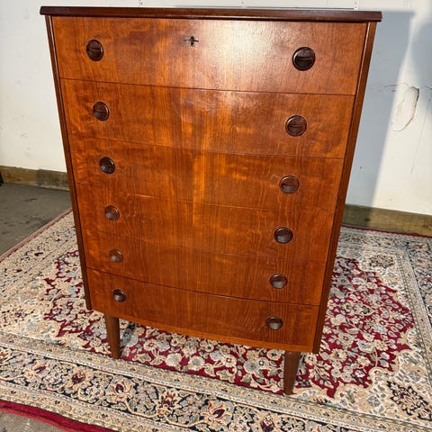 Flot kommode i teaktræ med 6 skuffer, buet front og orig. nøgle 🤎.