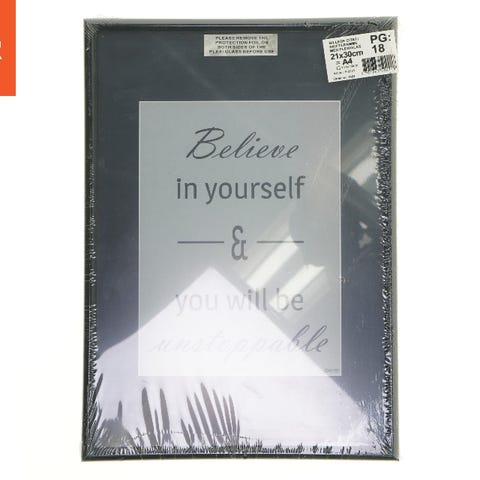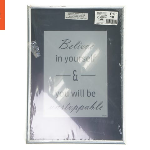 Dette er et billede med en inspirerende tekst, 'Believe in yourself & you will be unstoppable'. Billedet er indrammet og beskyttet med plexiglas. Det har en størrelse på 21x30 cm, hvilket svarer til A4. Rammen er sort og kan bruges til ophæng eller placering på enhver overflade. Passer godt til vægdekoration eller som en motiverende påmindelse på skrivebordet.