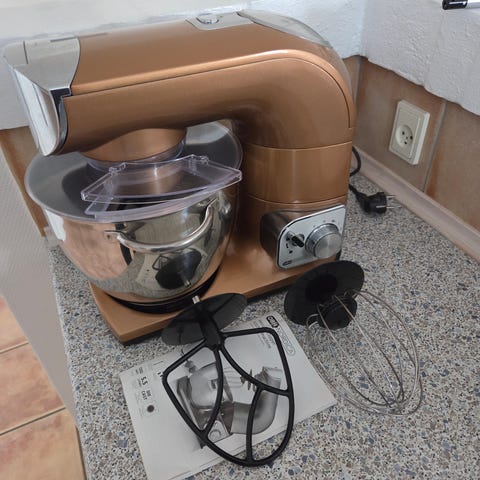 En kobberfarvet Hercules røremaskine fra OBH nordica med råstfri skål, dejkrog og fladpisker. Maskinen har justerbar hastighed, mulighed for tilslutning af tilbehør og er nem at gøre rent.