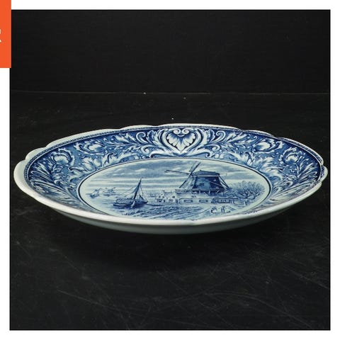 Stor dekorativt tallerken med en diameter på 31 cm, lavet af porcelæn. Tallerken har et flot blåt mønster rundt om kanten og et detaljeret motiv af et sejlskib i midten. På bagsiden er der et mærke, der indikerer tallerkens oprindelse eller producent, samt en metaltråd til ophængning. Velegnet som en del af en boligindretning eller som en samlerobjekt.