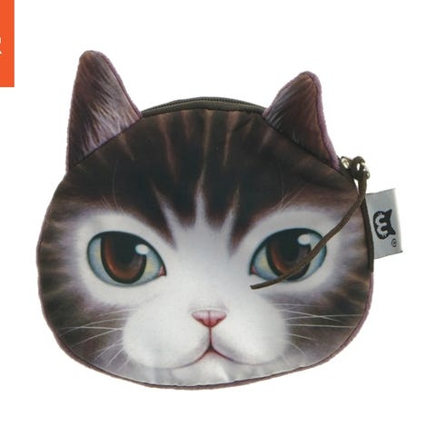En lille pung formet som et kattehoved med et realistisk kattemotiv på forsiden. Pungen har lynlås lukning samt en lille rem til håndleddet. Den måler 12x11 cm og er fremstillet af blødt materiale. Bagsiden af pungen er ensfarvet med et mønster, der passer til kattens farver.