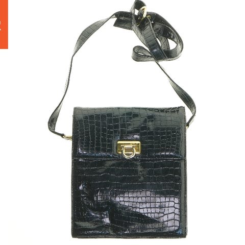 Denne skuldertaske har en klassisk sort krokodillemønsteret overflade, som giver et luksuriøst udseende. Tasken har en robust håndtag samt en justerbar skulderrem for behagelig transport. Den lukker med en metalspænde, der sikrer sikker opbevaring af dine ejendele. Taskens størrelse er 15x23 cm, hvilket gør den perfekt til at bære essentielle småting som telefon og pung.