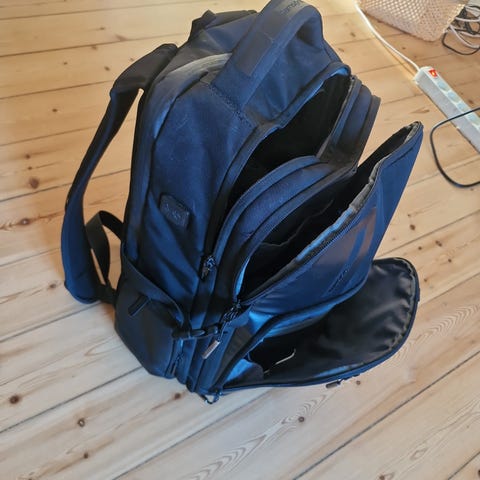 Rygsæk i grå tekstil med polstret ryg og skulderstropper. Tasken har lynlåslukning på fronten og flere indvendige rum, herunder polstret rum egnet til bærbar computer eller tablet samt ekstra lommer til mindre genstande. Yderligere lynlåslomme findes på ydersiden. Velegnet som hverdags- eller arbejdstaske.