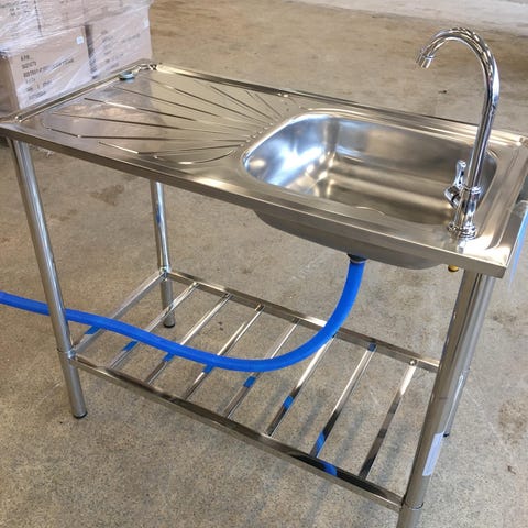 Austin and Barbeque udekøkken med vask og opbevaringsskab. Enheden har bordplade i rustfrit stål med integreret håndvask samt underskab med hylde til opbevaring. Skabet er monteret på hjul for nem flytning. På siden er der kroge til ophæng af redskaber samt håndtag på lågerne. Velegnet som modul i udekøkken eller som fritstående arbejdsbord med vask i udendørs miljøer.