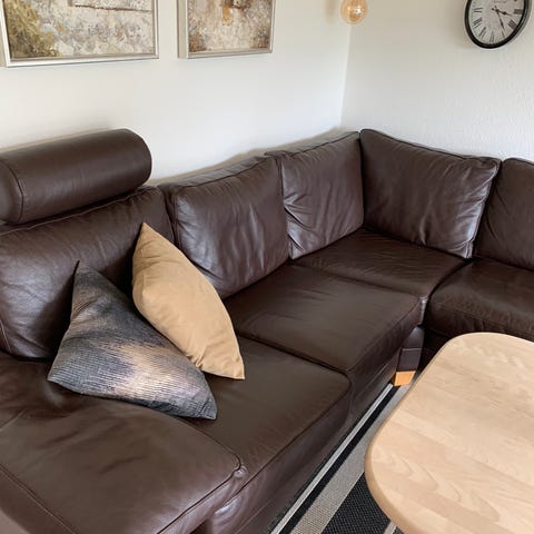 Hjørnesofa i brunt læder. . Sofaen har chaiselong/hjørnemodul og faste sæde- og ryghynder. Egnet til stue eller opholdsrum med plads til flere. Sofaen er nem at vedligeholde, og virkelig dejlig at sidde i. Den er fuldstændig uden fejl eller slid. . Der følger to nakkestøtter med, Sofaen sælges på grund af pladsmangel.