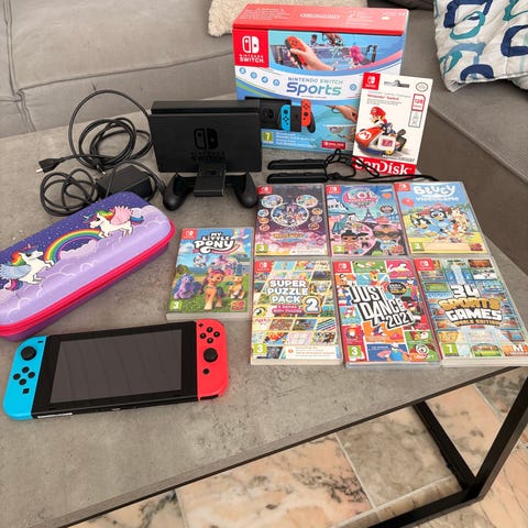 Nintendo Switch konsol med aftagelige Joy-Con controllere. Konsollen kan bruges både håndholdt og tilsluttet tv via docken. Sættet omfatter Nintendo Switch dock, strømforsyning og Joy-Con controllere i forskellige farver. Medfølgende bæreetui med Super Mario Odyssey motiv, der beskytter konsollen under transport. Velegnet til spil både hjemme og på farten for én eller flere spillere afhængigt af spillet.