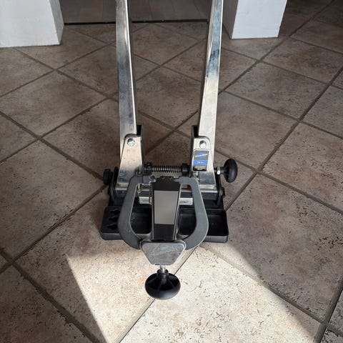 Park Tool hjulretter i blå metaludførelse. Stativet bruges til at rette og kontrollere cykelhjul ved montering og justering af eger. Egnet til værkstedsbrug eller hjemmebrug, hvor der er behov for præcis centrering af hjul. Justerbare arme gør det muligt at tilpasse stativet til forskellige hjulstørrelser.